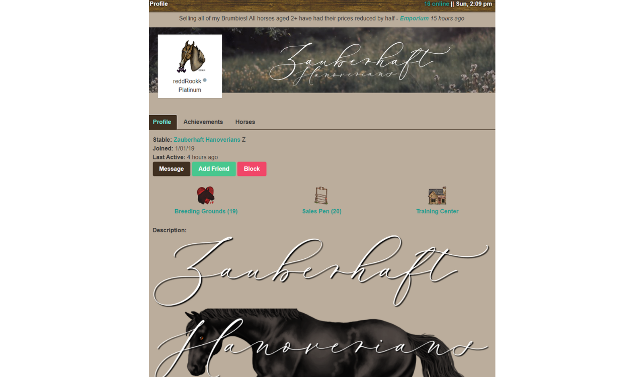 You will also be able to view your active Account Boosts (Needs Link/Page), Achievements (Needs Page), and overview of the total number of horses owned, broken down into stallions, mares, and foals. You can also access your personal Breeding Grounds, Sales Pen, and Training Center from your Profile Page.